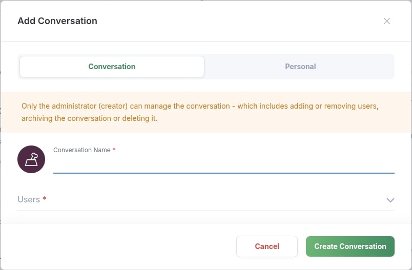 You can not just hover over someone’s name and start sending messages. In fact, when communicating with someone, you need to create a conversation room and then add the user you want to talk to. Moreover, only the administrator can manage the conversation, which includes adding or removing users, archiving the conversation, or deleting it.